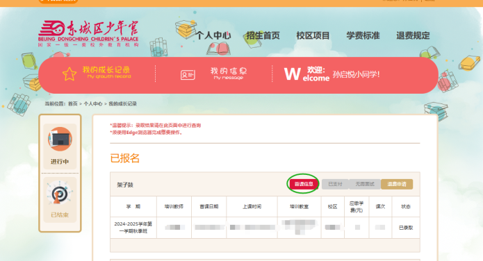 东城区少年宫所有学员均需通过官方报名网站完成网上缴费,请用电脑端登录网址 https://web.dcsng.cn 建议使用Edge浏览器。官方报名网站只在招生期间和开学期间对外开放,请按照相关工作通知要求完成缴费。 退费前请进入东城区少年宫招生网站https://web.dcsng.cn 查看《东城区少年宫学生学费退费规定》 缴费工作流程 1.登录学员账号进入“个人成长记录” 2.在已报名成功并录取的班级列表点击支付 3.按照提示选择“微信”或“网上银行”进行快捷支付 4.请在提交支付申请30分钟内完成缴费 5.支付成功后班级表格上方会显示“已支付” 温馨提示: 新生在缴费成功后即可下载打印首课信息,如下图所示: